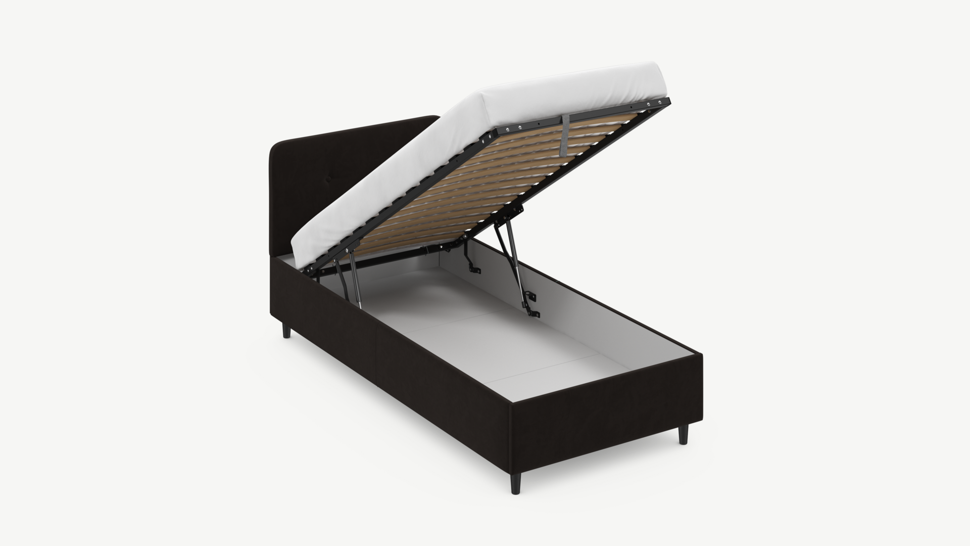 • Скрытая под основанием вместительная емкость без внутренних перегородок позволяет использовать всю площадь подкроватного пространства для хранения вещей.