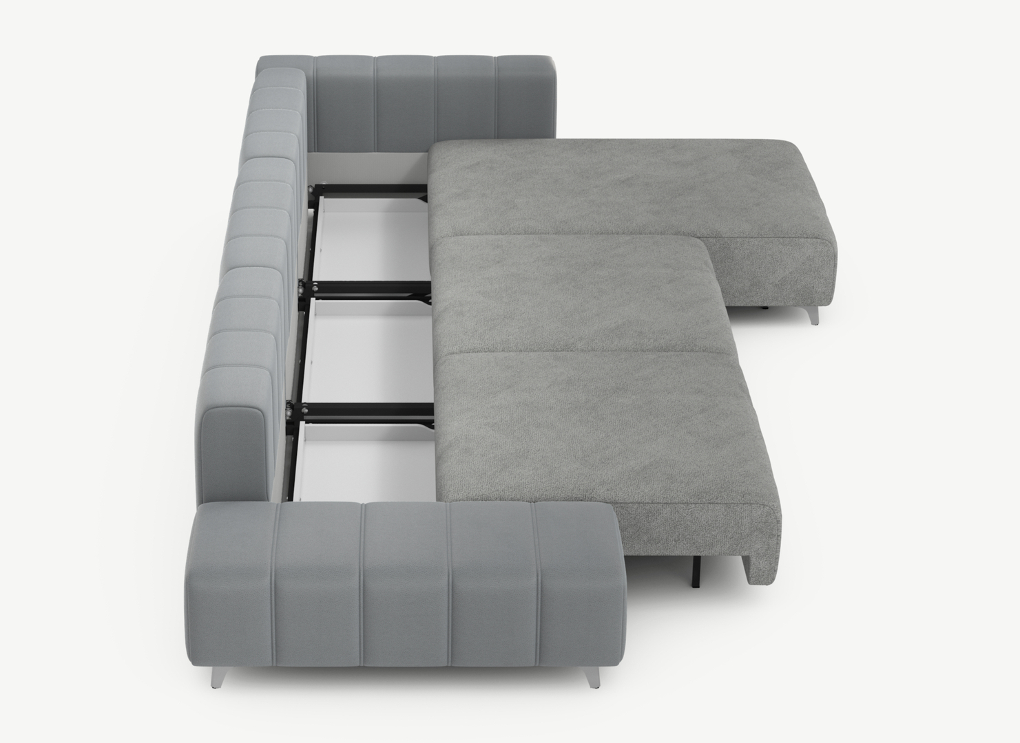 Посекционная трансформация дивана. Диван состоит из модулей, которые трансформируются независимо друг от друга, что позволяет изменять форму дивана, создавая индивидуальный комфорт для каждого. Например: Вы продолжаете смотреть телевизор, в то время как близкий человек может трансформировать другую секцию и прилечь.