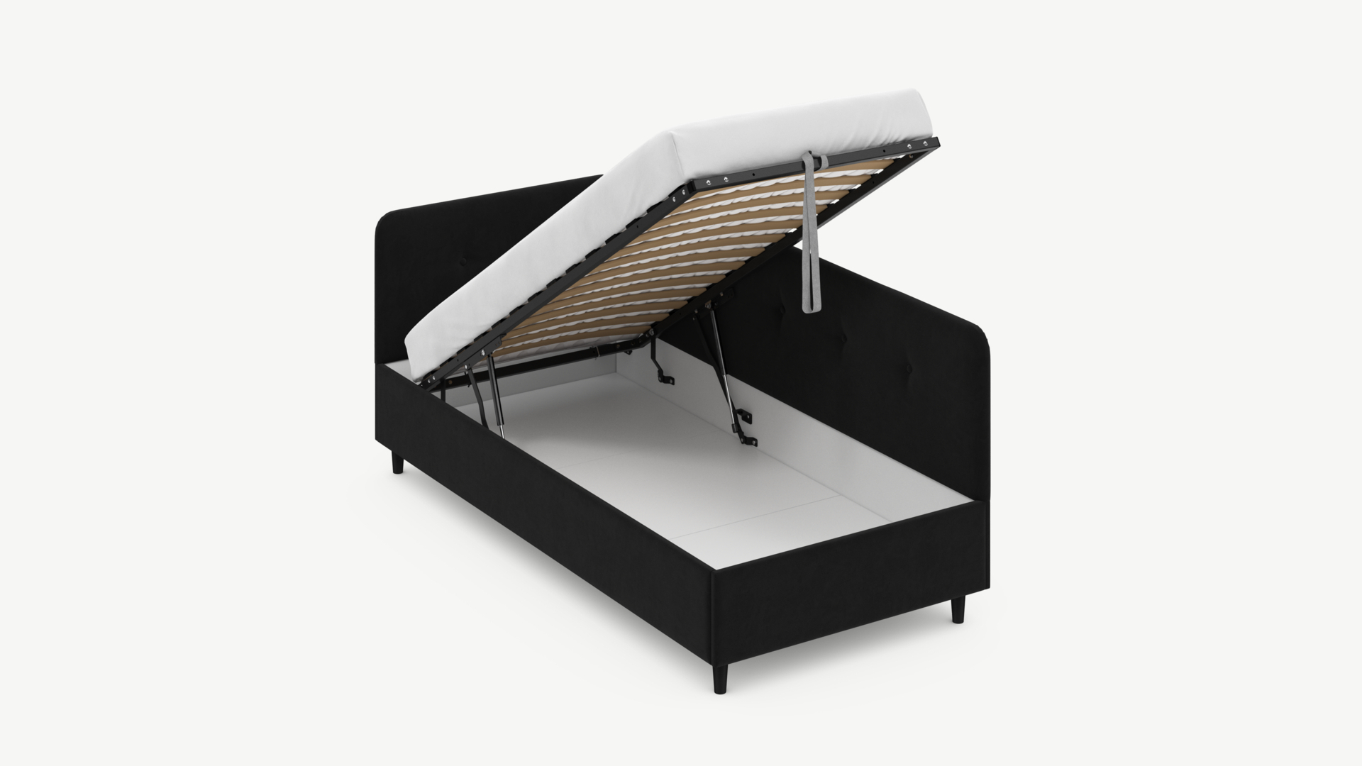 • Скрытая под основанием вместительная емкость без внутренних перегородок позволяет использовать всю площадь подкроватного пространства для хранения вещей.